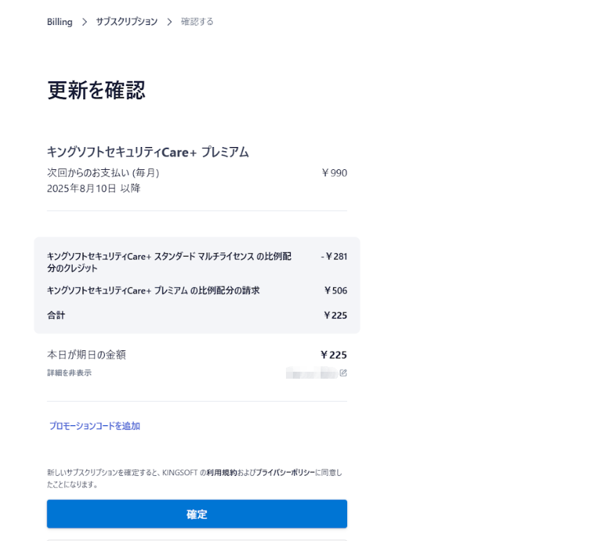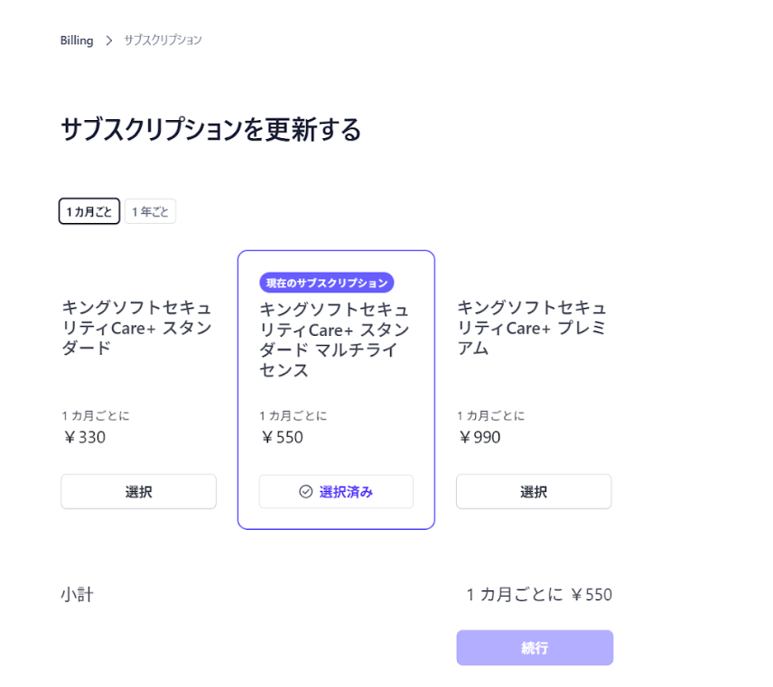 プランをアップグレードする場合、新しいプランが即時適用されます。キングソフトセキュリティCare+の利用料金は前払い方式となりますので、請求日は前回のお支払いの残高に応じて変更されます。