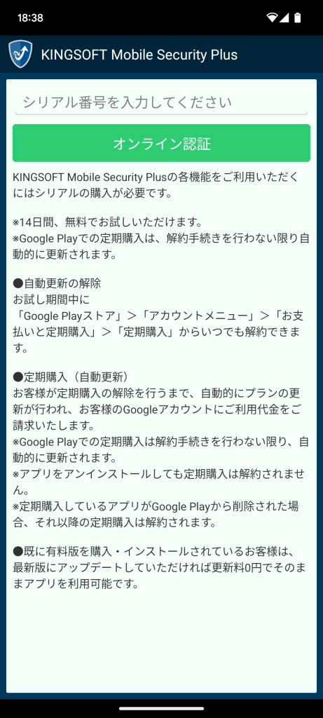 2.「シリアル番号を入力してください」と表示されたスペースに、キングソフトセキュリティCare+のシリアル番号を入力して「オンライン認証」をタップします。