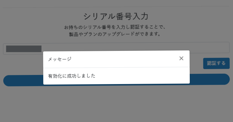 シリアル番号が有効になると、「有効化に成功しました」と表示されます。