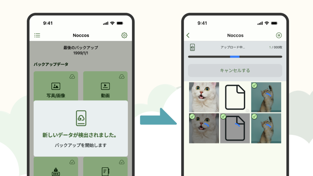 せっかく撮った写真のバックアップを忘れないよう、ノッコスには自動でバックアップを取る「おまかせバックアップ」機能が搭載されています。